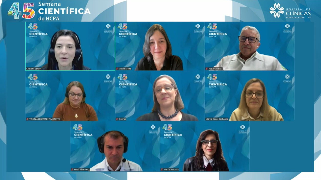 A cerimônia de abertura contou com a presença da reitora da UFRGS, professora Márcia Barbosa; do diretor-presidente do HCPA, professor Brasil Silva Neto; da diretora da Famed/UFRGS, professora Cristiane Leitão; da diretora da Escola de Enfermagem da UFRGS, professora Virgínia Moretto; da professora Márcia Kauer Sant’anna, representando a presidência da FundMed; do diretor do NITT/HCPA, professor Hugo Oliveira; e da diretora de Pesquisa do HCPA e coordenadora da 45ª Semana Científica, professora Ursula Matte.