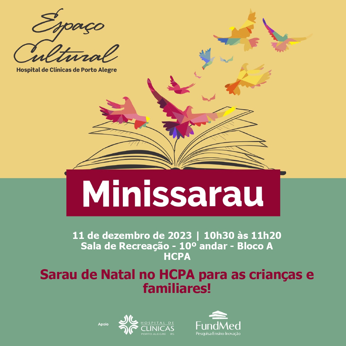 O Sarau de Natal no HCPA será realizado na próxima semana, dia 11/12, na sala de Recreação do 10º andar, às 10h30, para o público interno (pacientes, familiares e colaboradores do projeto).