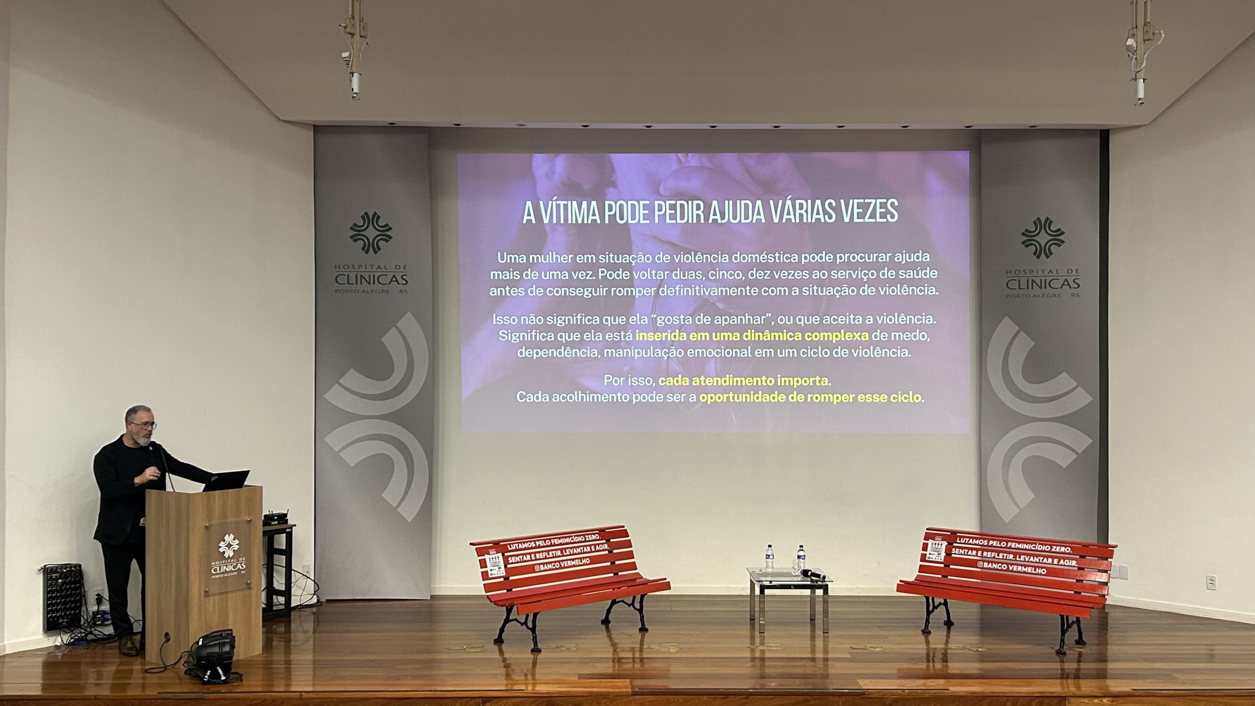 A ação integra o movimento do Instituto Banco Vermelho e simboliza a necessidade permanente de conscientização sobre o feminicídio. Como parte da iniciativa, os bancos instalados no hospital contam com adesivos que informam os contatos da Central de Atendimento à Mulher (180), canal nacional para denúncias e orientações, e da Brigada Militar (190), para situações de emergência — reforçando o caráter informativo e de utilidade pública da ação.