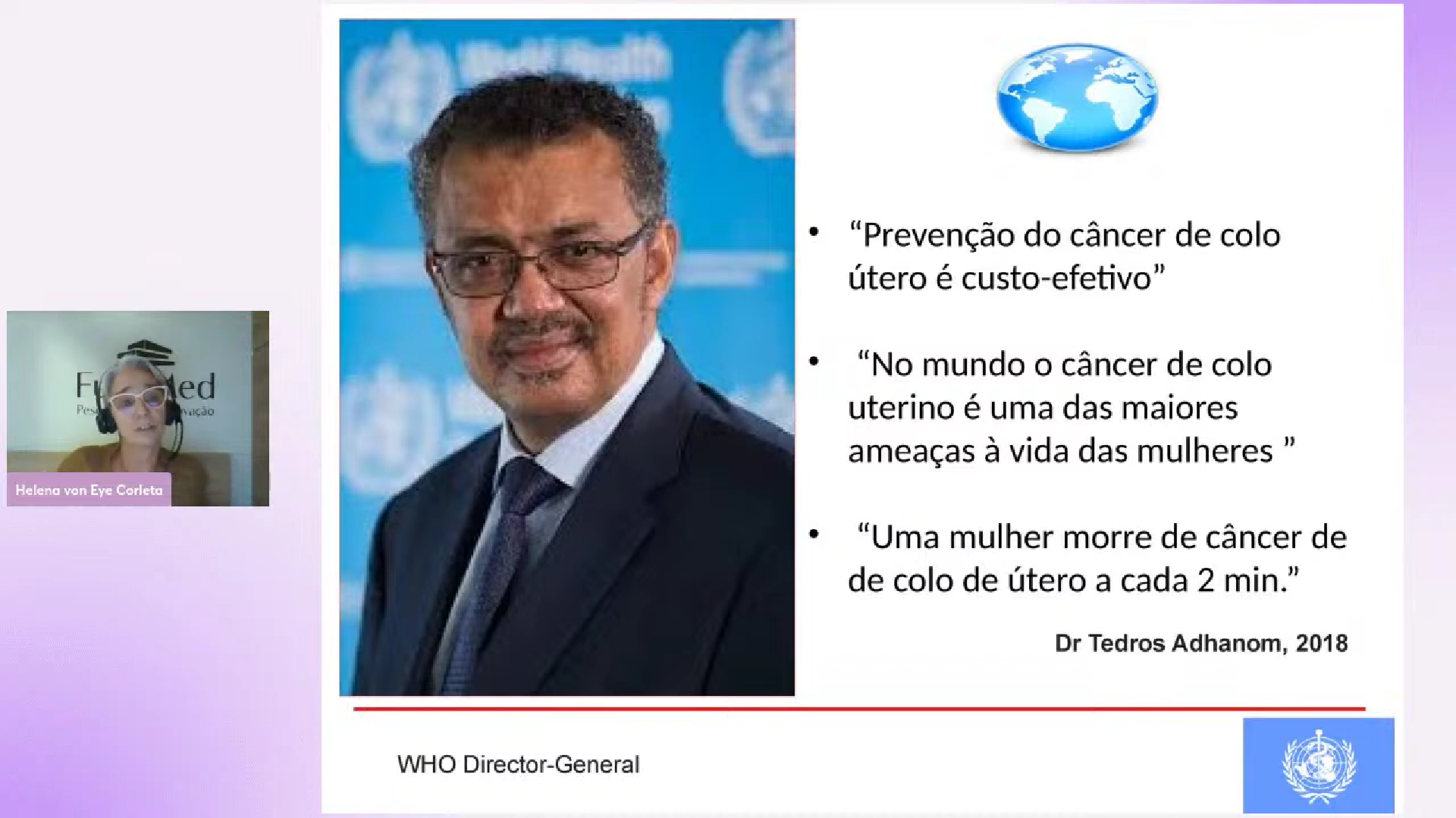 O Dr. Tedros Adhanom, Diretor-Geral da OMS em 2018, alertou sobre a gravidade do problema do câncer de colo de útero, afirmando que a prevenção desse câncer não só é custo-efetivo, mas também é uma questão de saúde pública urgente, já que representa uma das maiores ameaças à vida das mulheres, com uma morte ocorrendo a cada dois minutos.