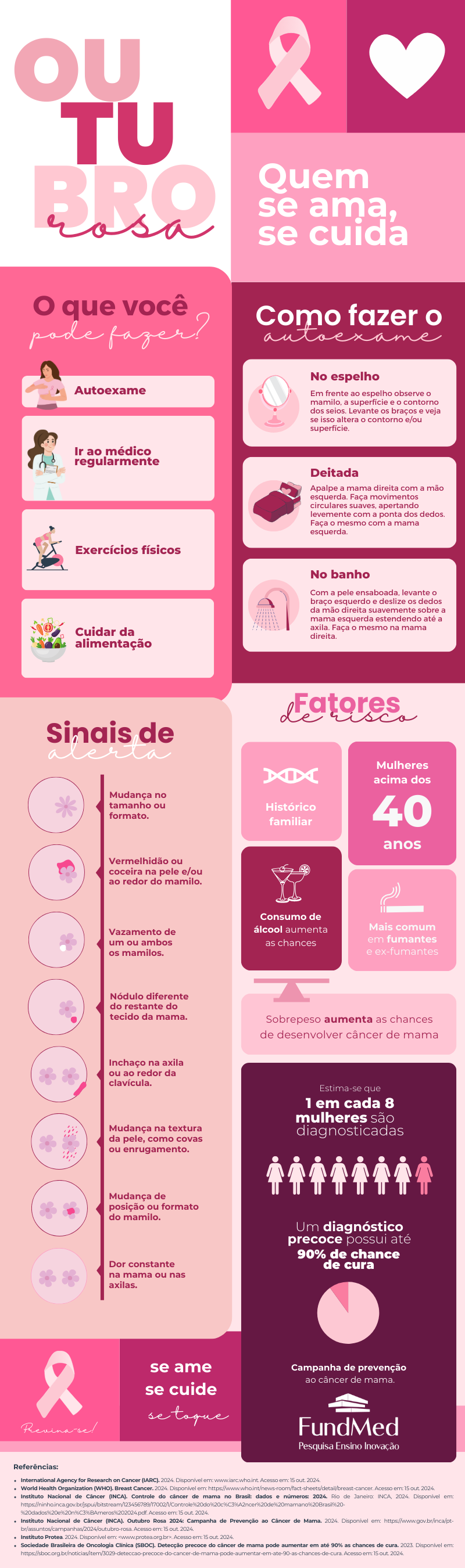 O infográfico ainda traz orientações detalhadas sobre como realizar o autoexame em diferentes situações do dia a dia, além de listar sinais de alerta que podem indicar alterações nas mamas, como mudanças no tamanho ou formato, vermelhidão na pele, vazamento nos mamilos, nódulos, entre outros. Também são apresentados os principais fatores de risco, como histórico familiar, idade acima de 40 anos e consumo de álcool.